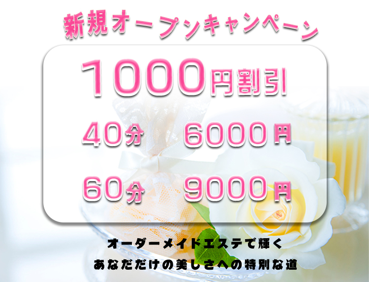 当店では、アロマオイルの効能と当店自慢のセラピストによるリンパマッサージの相乗効果による、癒しのひとときをお客様お一人お一人にお届けしております、自然で心やすらぐ優美な香りを、施術中はもちろんご帰宅お休みになってから翌日朝目覚めでまで楽しんで頂けます、どうぞゆっくりご堪能ください。